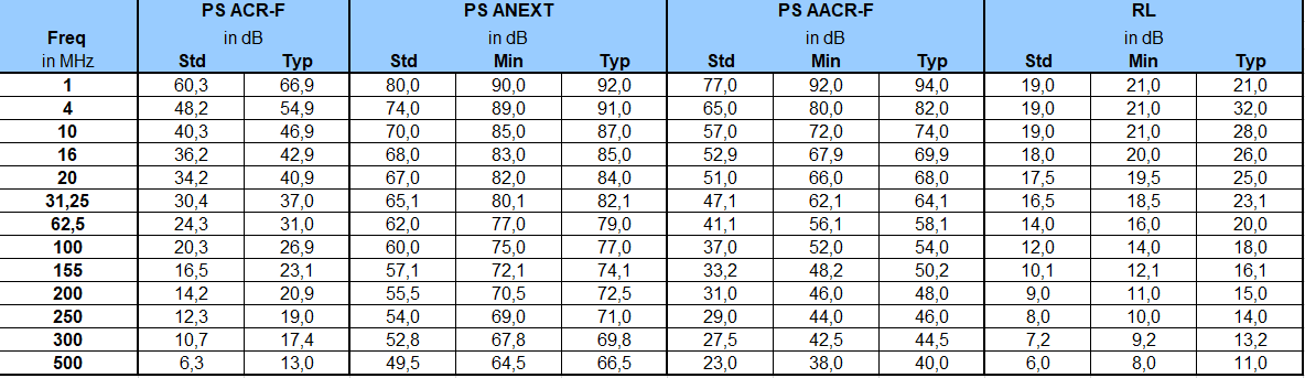 | All values are based on Worst Case 4 Connector Channel configurations according to ISO11801. Minimum and maximum values represent guaranteed Channel performance. Standard values based on ISO11801 Class EA |
