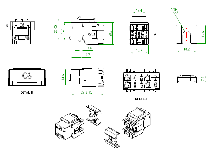 A linha de conectores CAT6 é a oferta de 250MHz, classe E padrão Nexans utilizado para conexões em salas de telecomunicações e área de trabalho. Fabricados e testados com a mais recente especificação da Categoria 6. Suporta aplicações Gigabit Ethernet 1000BASE-T. Retrocompatível com toda a linha CAT5 e 6 de patch cords, patch panel, espelhos, cabos e outros acessórios Nexans.